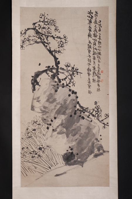 清代,水墨花鳥畫立軸,吳昌碩、王一亭合作,紙本。縱128.5厘米,橫63.3厘米??钍?ldquo;乙卯春一亭種水仙搬頑石,吳昌碩補(bǔ)梅并題”;鈐“缶翁”白文方印、“一亭父”朱文方印。構(gòu)圖險(xiǎn)奇,巨石斑駁渾厚,梅樹老干椏槎(chá),鐵骨錚錚,新枝旁出,穿插于其間,凌空屈曲,花開數(shù)朵,疏落有致,石旁水仙茂盛,纖塵不染。吳昌碩、王一亭合璧之作。