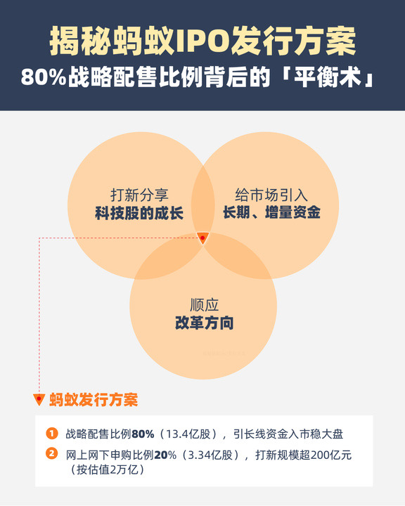 10月21日,科創(chuàng)板IPO獲證監(jiān)會同意注冊后,螞蟻集團(tuán)更新招股意向書并公布上市發(fā)行計劃。中證君發(fā)現(xiàn),螞蟻設(shè)置了較高的戰(zhàn)配比例以穩(wěn)定市場:戰(zhàn)略配售股票數(shù)占初始發(fā)行量的80%,約13.4億股。