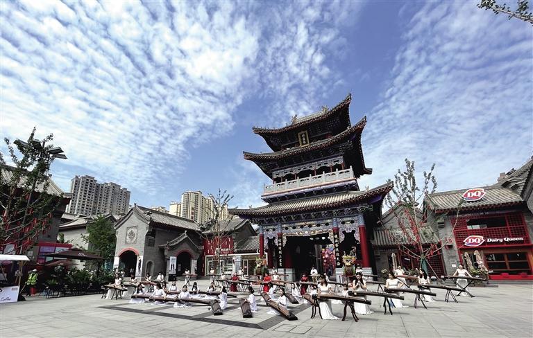 中國甘肅網(wǎng)6月28日訊 據(jù)蘭州日報報道(記者 李沛珂 攝)6月27日,由《蘭州日報》、西北民族大學(xué)、蘭州老街共同發(fā)起的“數(shù)箏齊奏頌黨恩”活動在蘭州老街舉行。來自西北民族大學(xué)音樂學(xué)院古箏專業(yè)“明·凈“箏團(tuán)的40多位師生,齊奏《我的祖國》、《盛世國樂》、《唱支山歌給黨聽》等耳熟能詳?shù)慕?jīng)典曲目,吸引路過的市民紛紛駐足圍觀,贏得陣陣掌聲。