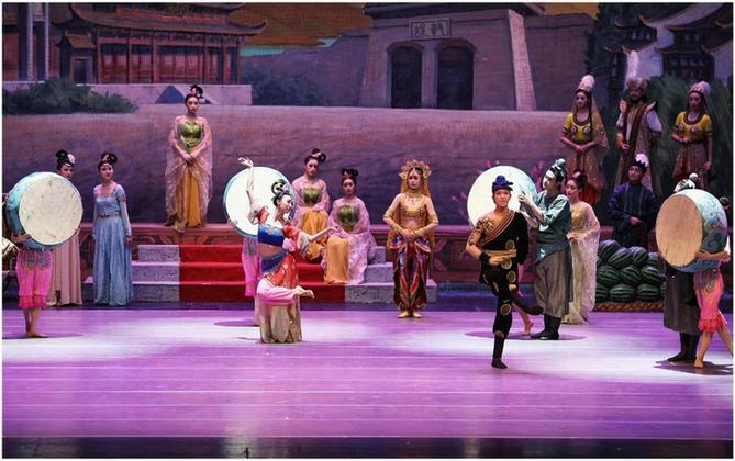 舞劇《絲路花雨》取材于敦煌莫高窟壁畫藝術(shù),融合了中國古典舞、印度舞、黑巾舞、波斯馬鈴舞、波斯酒舞、土耳其舞、盤上舞、新疆舞等各種藝術(shù)形式。該劇首創(chuàng)于1979年,甘肅省歌舞劇院于2008年修排了新版《絲路花雨》,并不斷進行創(chuàng)新。