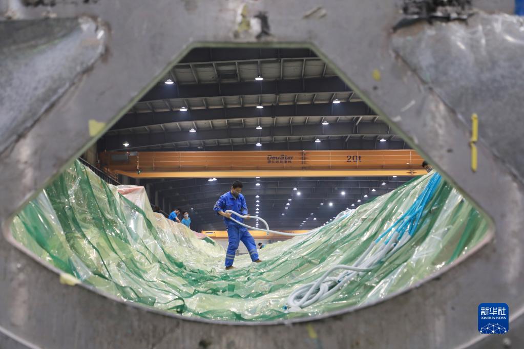 2月17日,在酒泉經(jīng)濟技術(shù)開發(fā)區(qū)的一家風電葉片制造企業(yè),工人在風機葉片生產(chǎn)線為葉片灌注做準備。