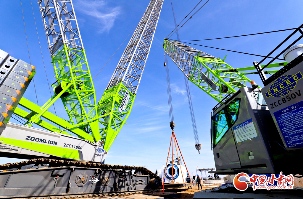 2月21日,張掖市臨澤縣平川北灘30萬千瓦風電項目建設現(xiàn)場,工作人員正在進行主機吊裝。
