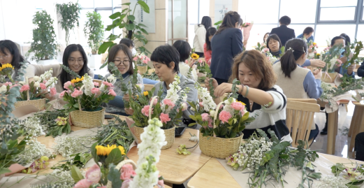 繁花似錦報春來,天姿國色抒情懷?;顒蝇F(xiàn)場花香四溢、芬芳溫馨,充滿著春天般的氣息,大家手捧鮮花,在花藝老師的講解下,開始學習各種鮮花所蘊含的花語祝福和選花、裁剪、搭配、造型及養(yǎng)護等藝術(shù)插花技巧。隨后,女工們將原本普普通通的月季、康乃馨、蝴蝶蘭、滿天星、向日葵等多種花材修剪整枝,根據(jù)不同的色彩和形狀有層次地搭配在一起。通過精心構(gòu)思造型、發(fā)揮創(chuàng)意想象,有的注重意境創(chuàng)設(shè)追求,有的突出枝情花韻之趣,有的抒展自然樸實風格……在細致地修飾和精心地創(chuàng)作下,一枝花、一棵草都變得詩情畫意和清新怡人,節(jié)日的喜慶氣氛瞬間升騰。