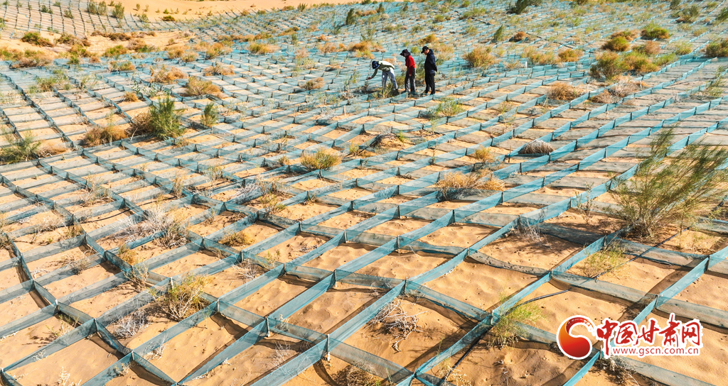 6月13日,張掖市高臺縣黑泉鎮(zhèn)北部荒漠區(qū)防沙治沙工程現(xiàn)場,林業(yè)技術(shù)人員正在壓沙方格內(nèi)查看栽植梭梭的生長情況。