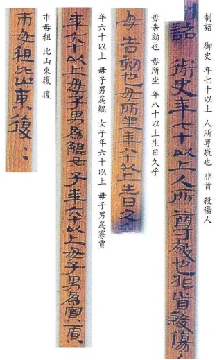 1981年出土于武威磨嘴子漢墓中的“王杖詔書令冊”簡則是關(guān)于古代敬老養(yǎng)老制度的法律法規(guī),堪稱古代“老年人權(quán)益保護(hù)法”。原簡背面有編號第一至第廿七,共27簡,但第15簡已缺失,余26簡首尾俱全。正面有556個字,雖歷經(jīng)千年,上面墨書的漢隸依然清晰可見。簡文內(nèi)容豐富,記載明確,既有撫恤鰥寡孤獨(dú)廢疾之人的具體做法,又有敬老養(yǎng)老高年賜王杖的明確規(guī)定。