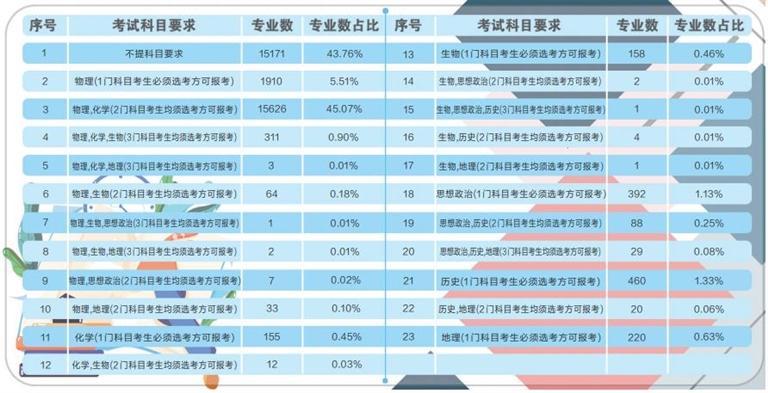 據(jù)了解,根據(jù)《甘肅省深化高等學(xué)??荚囌猩C合改革實(shí)施方案》要求,從 2021年秋季入學(xué)的普通高中一年級(jí)學(xué)生開始,實(shí)行基于統(tǒng)一高考和高中學(xué)業(yè)水平考試成績(jī)、參考綜合素質(zhì)評(píng)價(jià)的高校考試招生模式。到2024年,基本形成分類考試、綜合評(píng)價(jià)、多元錄取的高??荚囌猩贫?,健全促進(jìn)公平、科學(xué)選才、監(jiān)督有力的高??荚囌猩w制機(jī)制。此次在我省報(bào)送選考科目要求的高校專業(yè)共計(jì)64092條,其中本科專業(yè)34670條。專業(yè)選考科目要求共有23種組合,其中不提科目要求的本科專業(yè)數(shù)量占本科專業(yè)總數(shù)的43.76%,含物理科目的占比為51.79%,含化學(xué)科目的占比為46.46%,含歷史科目的占比為1.74%,含“物理+化學(xué)”科目的占比為45.98%。