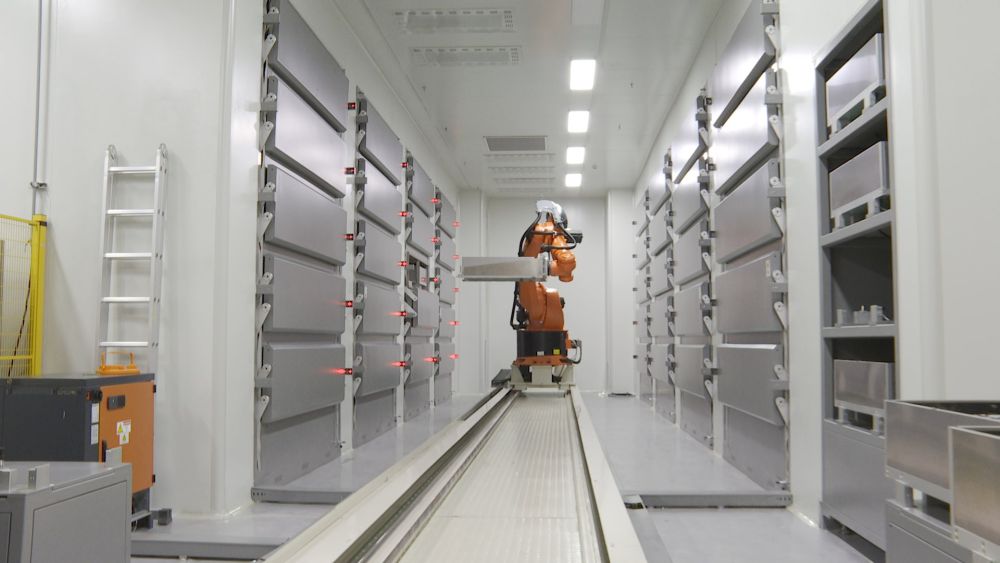 在一家企業(yè)的干燥車(chē)間內(nèi),六軸機(jī)器人正在搬運(yùn)成品電池。(受訪單位供圖)