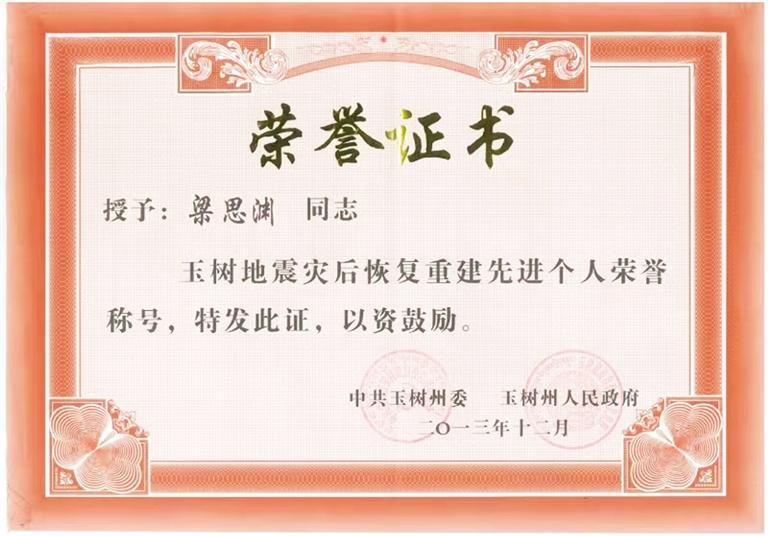 他一直這樣嚴于要求自己。因在格薩爾王賓館地震遺址維修保護項目中作出突出貢獻,梁思淵被玉樹州委、州政府評為“玉樹地震災后恢復重建先進個人”。疫情期間,他主動請纓,參與雁南路街道防疫物資運輸保障任務,轉(zhuǎn)運物資總計150多趟次。