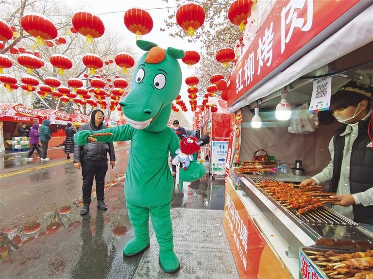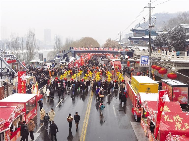 中國甘肅網(wǎng)2月3日訊 據(jù)蘭州晚報報道 2月2日北方小年當天,黃河市集在北濱河路白塔山公園門前熱鬧開市?,F(xiàn)場,大紅燈籠高高懸掛、福字帳篷年味滿滿,紅柳烤肉、冰糖雪梨、糖葫蘆、糖畫、牛奶雞蛋醪糟、丁娃燒餅等特色小吃攪動著市民游客的味蕾;民間手藝人制作的非遺手工藝品、洮硯、傳統(tǒng)絨花做工精巧,吸引了許多人駐足欣賞;太平鼓、舞獅等表演在市場上掀起了高潮,許多市民游客上前摸摸獅子討個好彩頭,在小年這天沉浸式體驗了新春市集里的幸福煙火氣息。