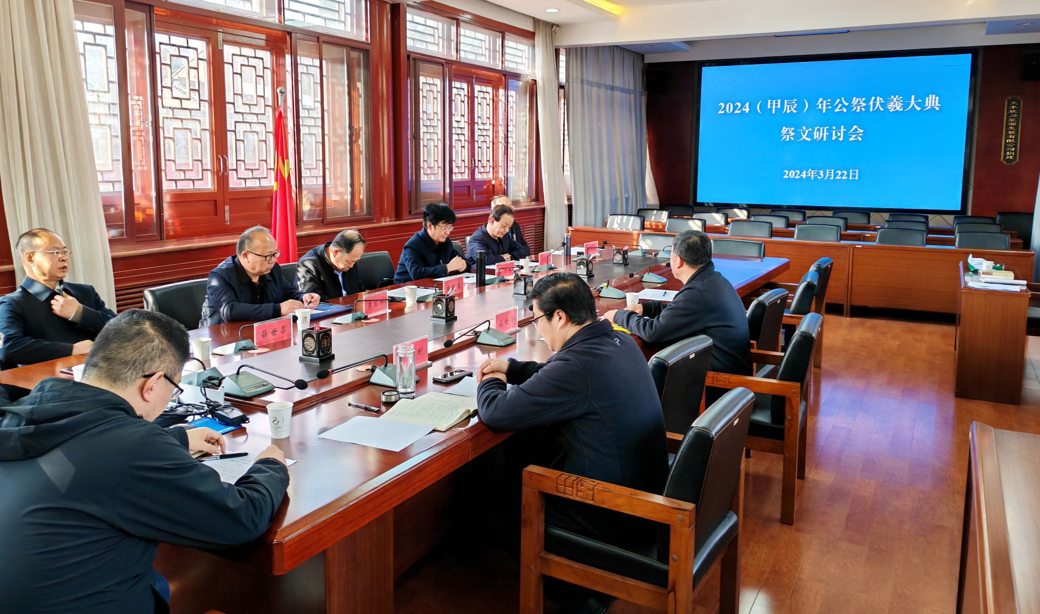 會上,“祭伏羲文”主筆霍志軍教授介紹了今年創(chuàng)作起草祭文的思路,大家對霍教授起草的祭文給予了高度評價,同時也對祭文的部分內(nèi)容發(fā)表了各自的看法和建議。經(jīng)過認真討論,結(jié)合近期國內(nèi)新聞、熱點時事、政府工作報告等資料,與會專家對祭文的內(nèi)容、措辭、音韻等方面作了逐字逐句的細致推敲,達成統(tǒng)一意見,形成了“祭伏羲文”市級專家初評意見稿。