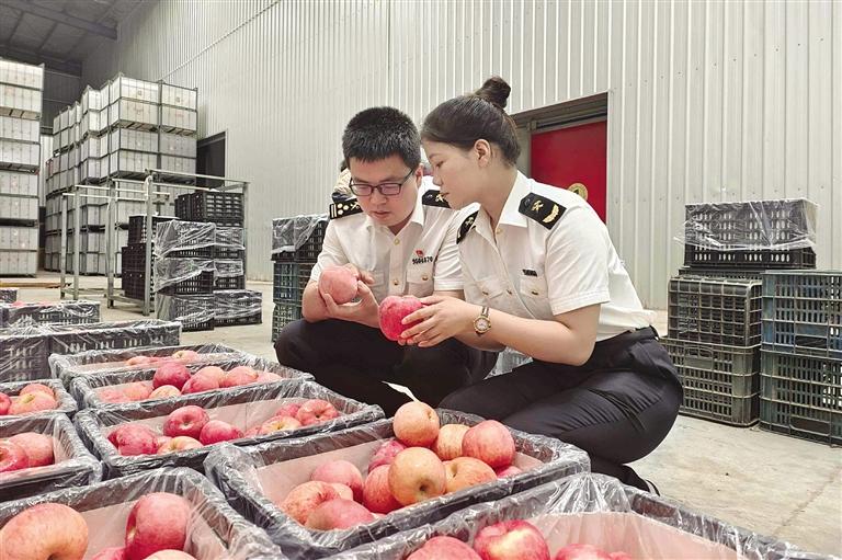 圖為海關(guān)關(guān)員檢查出口水果。據(jù)悉,上半年甘肅省出口水果價值4.56億元,同比增長42.7%。