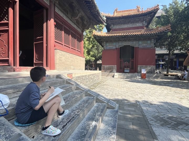 夜幕低垂,華燈初上,身著漢服的女孩徐行古跡之間。烈日當頭,少年定坐在古老建筑旁安靜臨摹,筆下的雕梁畫棟多了樸拙意趣。“正定的古建筑很美,畫之前要細細觀察,但不能原封不動地畫。畫得好,就很滿意、很開心。”今年12歲、從北京前來研學的米騰飛說。