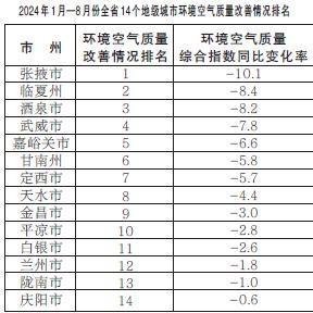 2024年1月—8月份,全省14個(gè)地級(jí)城市環(huán)境空氣質(zhì)量改善情況排名由好到差分別為:張掖市、臨夏州、酒泉市、武威市、嘉峪關(guān)市、甘南州、定西市、天水市、金昌市、平?jīng)鍪小足y市、蘭州市、隴南市、慶陽市。
