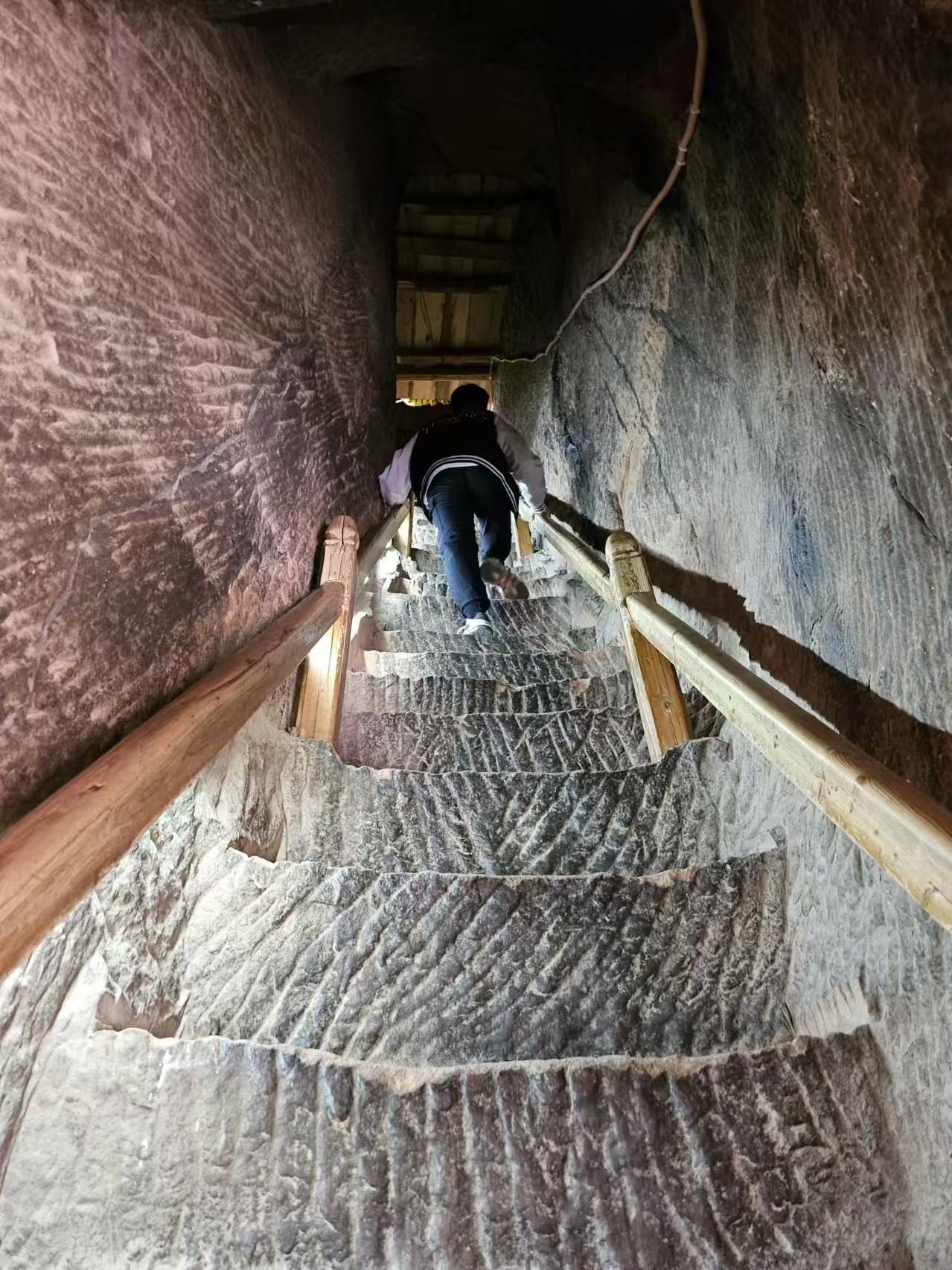 由第一層的北邊入內(nèi),隧道呈“之”字形,回廊曲折。里邊只能容納一個(gè)人行走,兩個(gè)人并坐,一共上去有129個(gè)臺(tái)階。石窟中的石砌臺(tái)階百轉(zhuǎn)千回,高低不一,不少階梯需要手腳并用才能上去,其艱難程度激發(fā)了游客的攀登欲,也有了“不到長城非好漢,不登三十三天真遺憾”的說法。