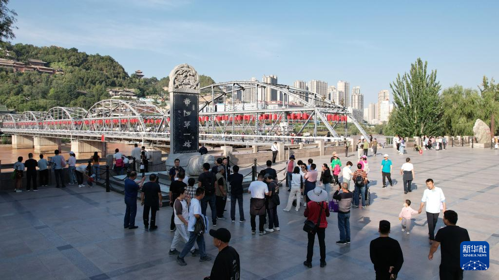 游客在蘭州地標——中山橋參觀游覽(9月23日攝,無人機照片)。新華社記者陳斌攝