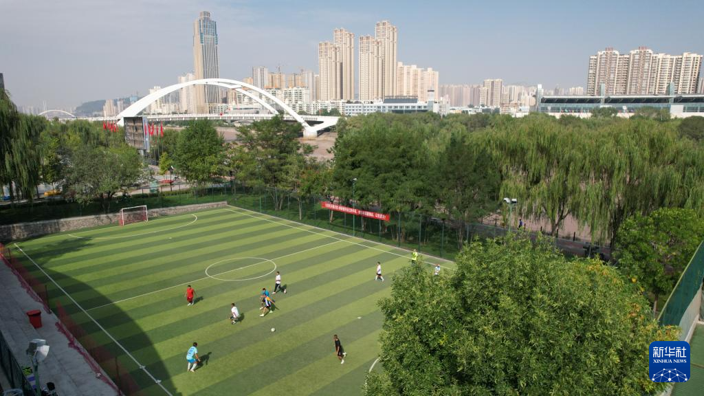 市民在位于黃河蘭州段南岸的體育公園足球場內踢球(9月24日攝,無人機照片)。新華社記者陳斌攝