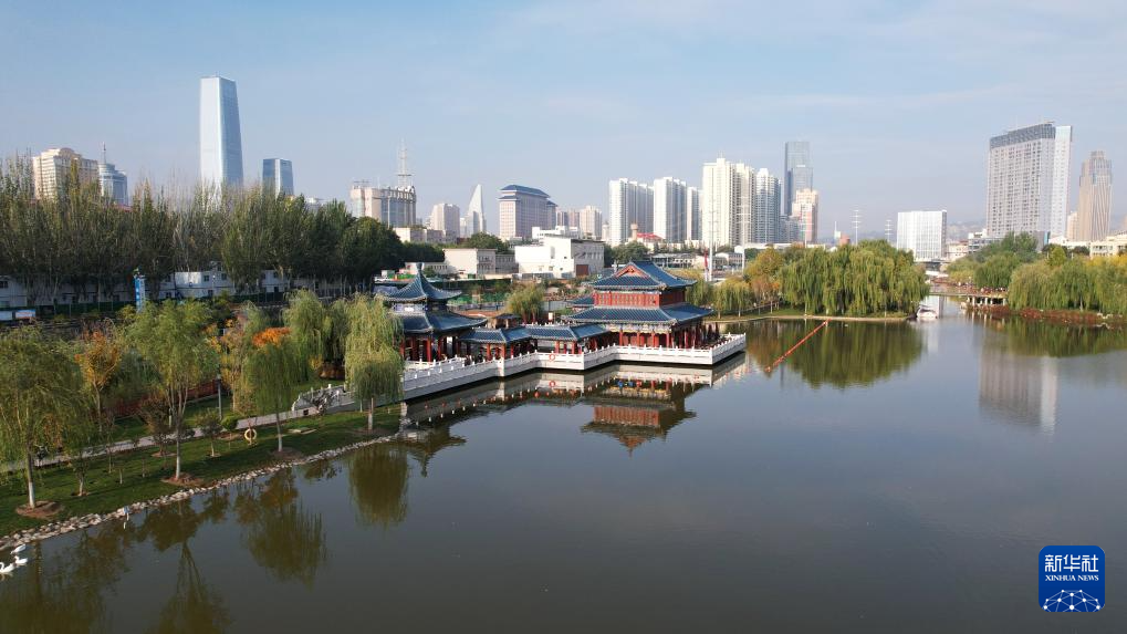 這是位于蘭州市城關區(qū)黃河岸邊的雁灘公園(10月17日攝,無人機照片)。新華社記者陳斌攝