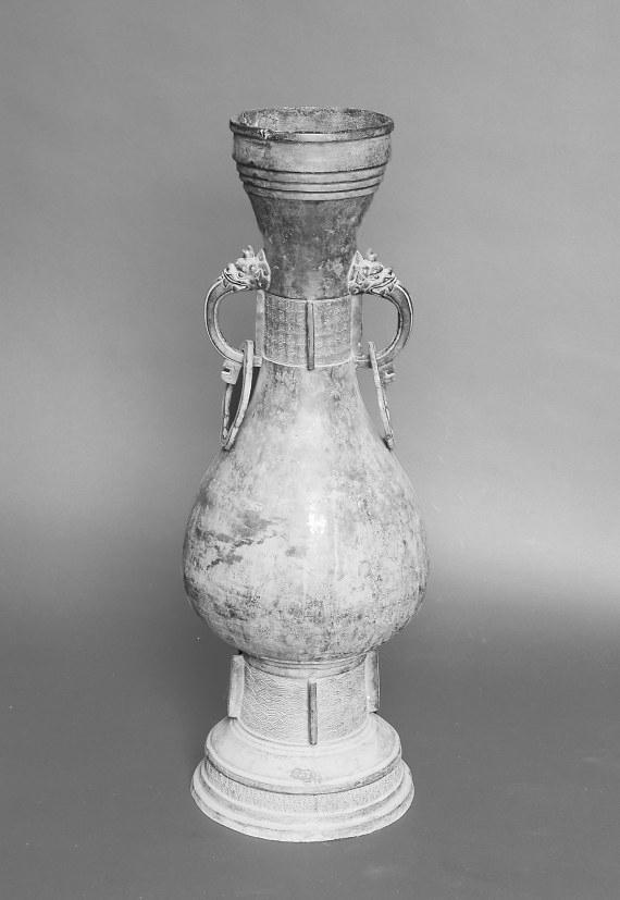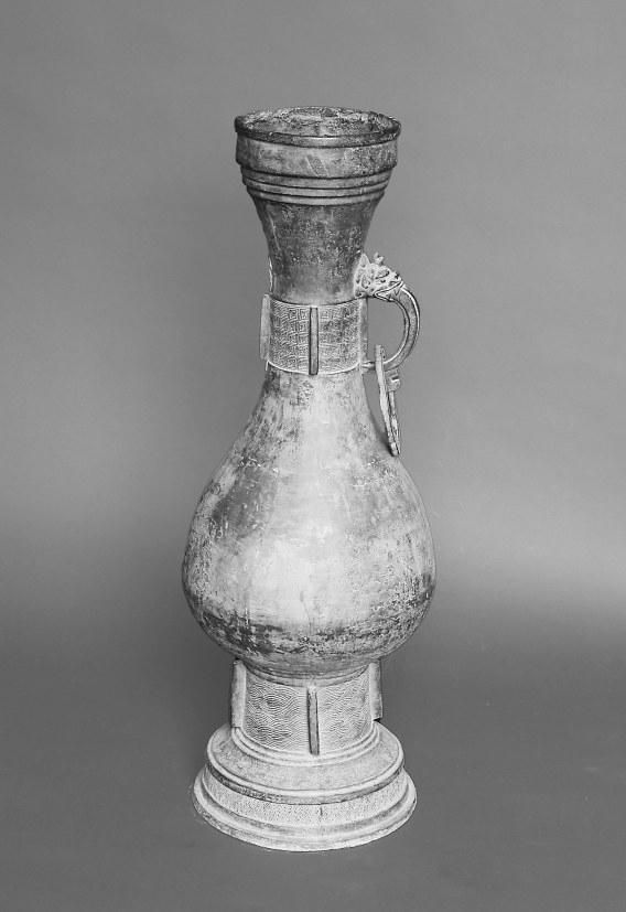 明獸面銜環(huán)耳銅瓶:該銅瓶古樸修長、厚重。銅瓶為一對,形制及紋飾相同,高0.9米,口徑0.19米,重43.86千克。直口,外卷方唇,束長頸,對稱置獨(dú)角獸吐舌形半環(huán)耳,下帶小珥,耳套如意形環(huán),垂膽形腹,束高脛,下為折肩形圈足,足口外撇,無底。口沿下飾三道凹弦紋,頸部飾四個(gè)等分菲棱,間以雷地紋,脛部飾四菲棱間以鱗形波浪紋,圈足飾菲棱形回紋。銅瓶原存放于崆峒山太和宮真武殿真武像前,置于韓王鼎左右。