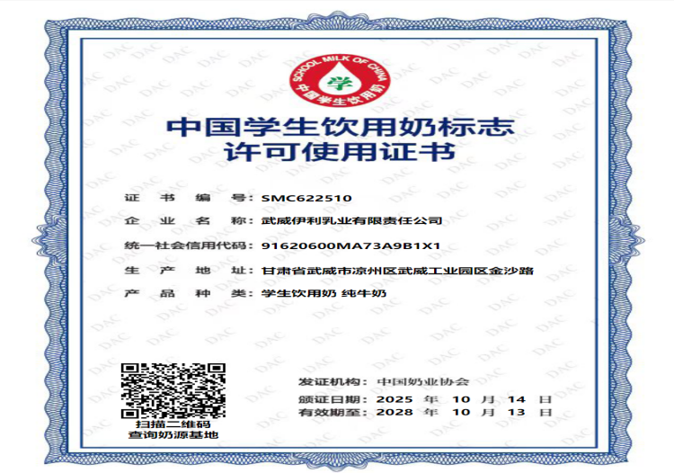 高效推進的背后,是黨建引領的強勁引擎,更是企業(yè)擔當?shù)纳鷦釉忈?。從完成材料填報提交,到順利通過材料審查,再到圓滿完成現(xiàn)場審核、進入公示階段,武威伊利僅用37天就完成了全流程申報,成功獲取“中國學生飲用奶標志許可使用證書”,創(chuàng)造了學生奶資質(zhì)申請的“伊利速度”傳奇,這不僅是對伊利產(chǎn)品品質(zhì)的充分認可,更彰顯了黨建賦能的硬核實力。