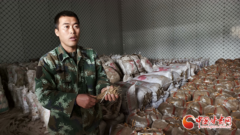 定西禾大壯農(nóng)業(yè)科技發(fā)展有限責(zé)任公司技術(shù)人員李玉棟在冷庫中展示在大棚中反季節(jié)培育的當(dāng)歸苗