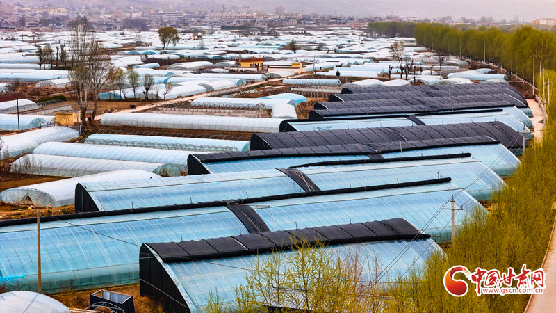 武山縣洛門鎮(zhèn)宋莊村一座座現(xiàn)代化溫室大棚整齊排列