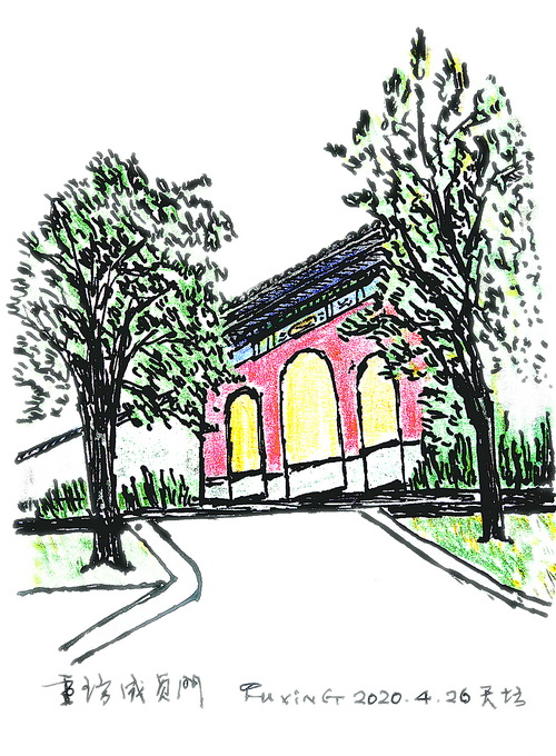 書已寫罷,小寒節(jié)氣過后,我又多次去天壇,不為寫作,只是習(xí)慣,仿佛腳步慣性,去天壇轉(zhuǎn)轉(zhuǎn),就會感覺充實一些。2020年1月20日正值大寒節(jié)氣,那天下午,我從圜丘到成貞門西北側(cè),那里并排有兩把座椅,我坐在座椅上畫成貞門。春節(jié)將近,除了工人在懸掛紅燈籠、安裝慶祝春節(jié)的展牌,天壇里的游人并不多。我和很多游人一樣,不知道,或者說不敏感,一場疫情正如餓虎撲食那樣向我們迫近。