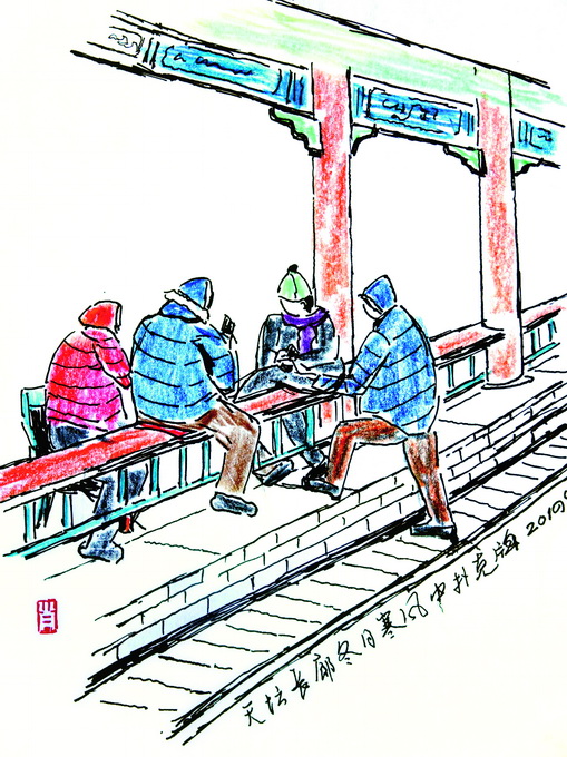 童年時,我家離天壇很近,即便是現(xiàn)在的住所,離天壇也不算遠,地利之便,使我和天壇有種天生的緣分。這種緣分不是一見鐘情,而像長時間接觸磨出來的老繭,結(jié)實且持久。幾十年來,天壇是我最常去的公園,最近幾年迷上畫畫,更要去那里畫速寫。由于畫畫,身邊總會站著幾個看畫的人,無論褒貶,一定得聊上幾句。以前有人看我畫畫,我老覺得不自在,后來臉皮不僅變厚了,心里還冒出個念頭:如果天天到這里畫畫,可以接觸到好多人,隨手記下各色人等的人生百態(tài),這不是挺有意思的嗎?