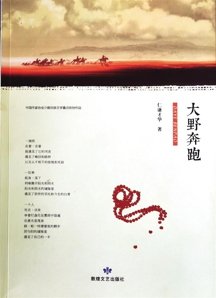 詩(shī)歌集《大野奔跑》是仁謙才華近年來(lái)的傾心之作,該作品由敦煌文藝出版社出版發(fā)行。詩(shī)集由作家張存學(xué)作序,收錄了仁謙才華4年來(lái)發(fā)表在《詩(shī)刊》等刊物上130余首詩(shī)歌。張存學(xué)在序中這樣評(píng)價(jià):“語(yǔ)言,既是阻礙,也是抵達(dá)之路,這個(gè)緊張度也是考驗(yàn)一個(gè)寫(xiě)作者的坎,這個(gè)坎過(guò)得好一些就能夠把握住詩(shī)抵達(dá)生命的本真,把握不好,就會(huì)在空泛的意象中游走。仁謙才華在這方面的蛻變,從他這本詩(shī)集能夠看出,他由早期的直抒胸意、向外張揚(yáng)變得安靜起來(lái),變得從容而多思,也變得獨(dú)立而內(nèi)在……”