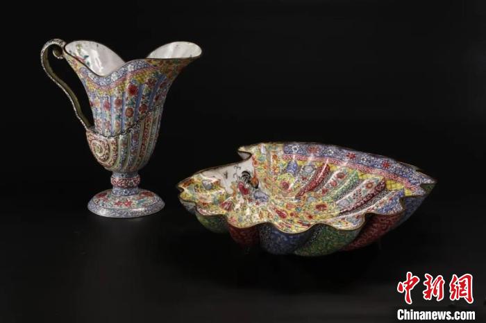 館藏的銅胎畫(huà)琺瑯花卉紋洗盤(pán)及水澆。廣東省博物館 供圖