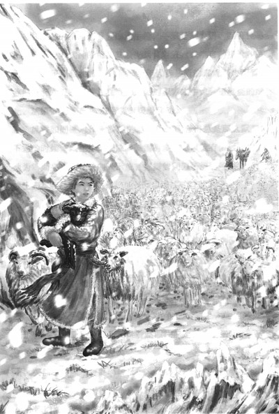 《金珠瑪米小扎西》插圖,小扎西在山間牧羊。何毅畫