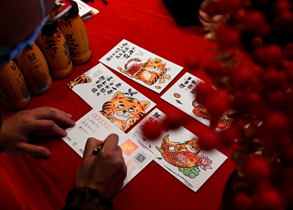 2月6日,市民在明信片上寫下詩詞。