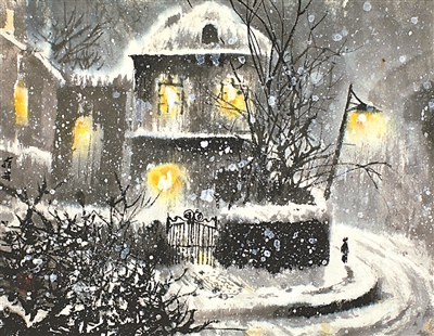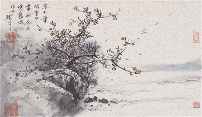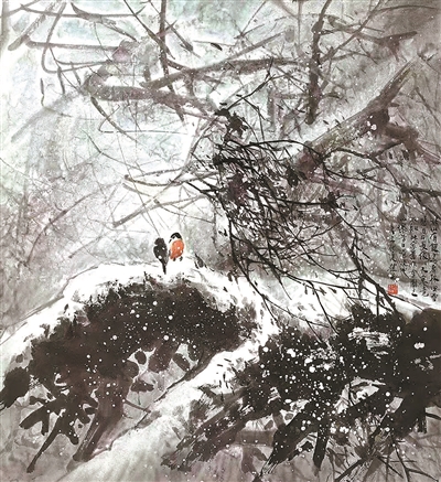 馮先生還和夫人在每年結(jié)婚紀(jì)念日時(shí)一起作畫,“我們?nèi)ツ赀^了綠寶石婚,結(jié)婚55周年。每到結(jié)婚紀(jì)念日,都是我們倆人畫一幅,畫一對(duì)小鳥。早在六七十年代最艱苦的時(shí)候就開始了,因?yàn)槲曳蛉艘彩钱嫯嫷模覀兡菚r(shí)一起畫了一對(duì)小鳥在風(fēng)雪里,那幅畫我現(xiàn)在還有。后來我們一直畫鳥,風(fēng)景在不斷地變化,這和我們對(duì)生活的感受有很大的關(guān)系。”