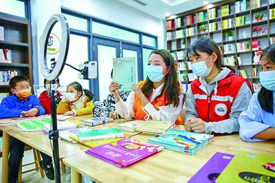 在江蘇如皋市如城街道顧莊社區(qū)農(nóng)家書屋內(nèi),志愿者通過網(wǎng)絡平臺為學生推薦好書。徐慧攝/光明圖片