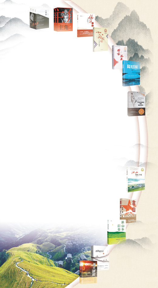 書(shū)影圖片從上至下依次為《人世間》《主角》《海邊春秋》《十八洞村的十八個(gè)故事》《國(guó)家溫度》《琵琶圍》《遠(yuǎn)去的白馬》《江山如此多嬌》《靠山》《新山鄉(xiāng)巨變》《西海固筆記》《重卡雄風(fēng)》(按出版時(shí)間排序)。何向陽(yáng) 供圖;底圖為廣西龍勝各族自治縣龍脊梯田景色。韋吉陽(yáng) 攝(人民視覺(jué))