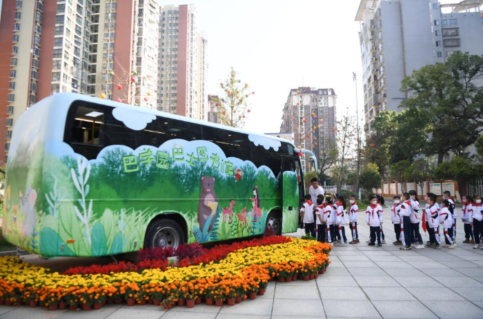 近日,長(zhǎng)沙市青園友誼小學(xué)的巴士圖書(shū)館開(kāi)館,吸引學(xué)生們前來(lái)閱讀、體驗(yàn)。巴士圖書(shū)館由一臺(tái)廢棄巴士改造而成,目前共藏書(shū)4000多冊(cè)。
