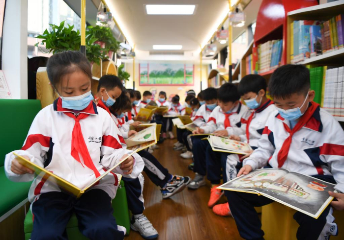 11月10日,學(xué)生在長(zhǎng)沙市青園友誼小學(xué)巴士圖書(shū)館內(nèi)閱讀。