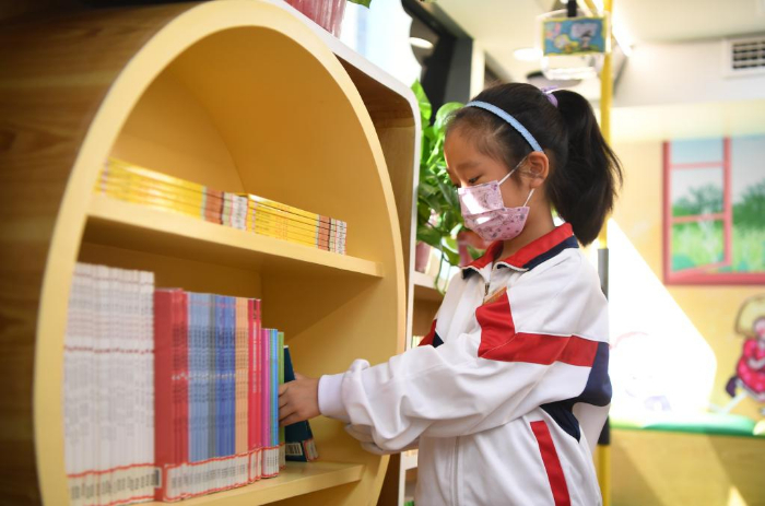 11月10日,學(xué)生在長(zhǎng)沙市青園友誼小學(xué)巴士圖書(shū)館內(nèi)歸還圖書(shū)。