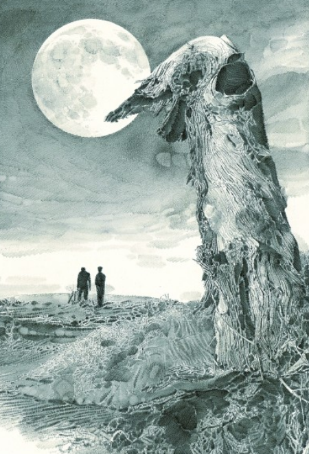 一輪滿月在大漠天空中懸浮著,兩個人行至遠方的沙地,并肩好似在暢談著什么??窃凇蹲x者》2019年第五期的這幅插圖,出自魯迅美術(shù)學(xué)院教授李晨之手,他以寫實的素描手法為陳忠實的文章《毛烏素沙漠的月亮》配圖,畫面細膩而充滿想象空間。