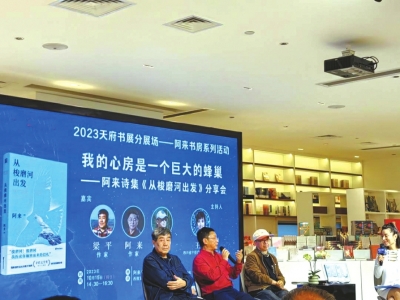 2023天府書展,各種名家分享會讓讀者應接不暇。除了成都世紀城新會展中心主會場,分會場的活動也精彩紛呈。10月15日下午,在西部文化產業(yè)中心阿來書房,阿來、葉舟、梁平三位名家開啟“我的心房是一個巨大的蜂巢——阿來詩集《從梭磨河出發(fā)》分享會”。三人上演老友記,分享會由阿來的青春期談起,氛圍詼諧幽默、愜意深情。