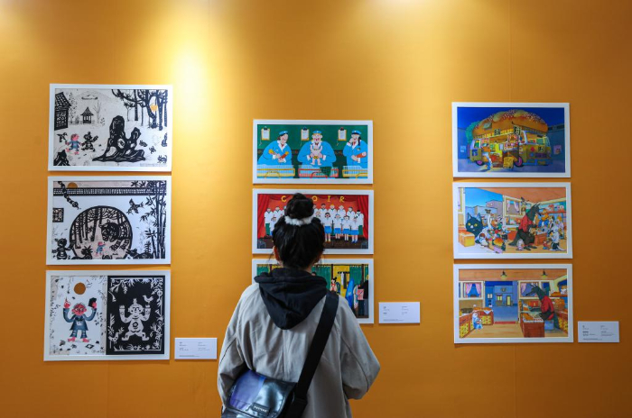 11月17日,參觀者在第十屆中國上海國際童書展現(xiàn)場觀看“2023金風車國際青年插畫家大賽”參賽作品。