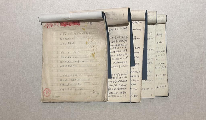 在展覽“青春萬歲”單元,一件珍貴的展品吸引眾人目光——5卷泛黃的稿紙上,寫著一行行藍(lán)色鋼筆字,這正是王蒙創(chuàng)作《青春萬歲》的初稿。