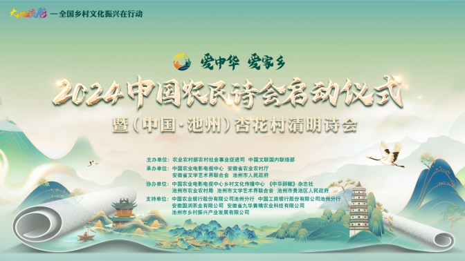 大地流彩,詩賦“三農(nóng)”。3月31日,“大地流彩—全國鄉(xiāng)村文化振興在行動”重點活動“愛中華愛家鄉(xiāng)”2024中國農(nóng)民詩會啟動儀式暨(中國·池州)杏花村清明詩會在安徽池州杏花村文化旅游區(qū)舉辦,主題為“春和景明詩出池州”。本次活動由農(nóng)業(yè)農(nóng)村部農(nóng)村社會事業(yè)促進司、中國文聯(lián)國內(nèi)聯(lián)絡部主辦,中國農(nóng)業(yè)電影電視中心、安徽省農(nóng)業(yè)農(nóng)村廳、安徽省文學藝術界聯(lián)合會、池州市人民政府承辦。