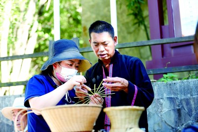 胡長心向游客介紹五峰竹編技藝。鄭兵攝