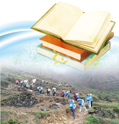 常紹慧和幾個同事先跑上山去,到村里挨家挨戶找老鄉(xiāng)借背簍,另一撥同事則在山腳下整理書籍。不一會,大家把書和禮物分裝進借到的幾個背簍里,每人背著一個背簍上山。