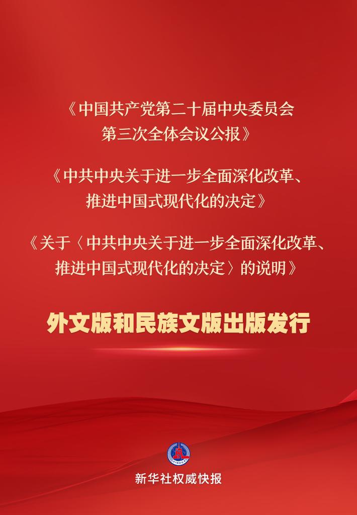 《中國共產(chǎn)黨第二十屆中央委員會第三次全體會議公報》《中共中央關(guān)于進(jìn)一步全面深化改革、推進(jìn)中國式現(xiàn)代化的決定》《關(guān)于<中共中央關(guān)于進(jìn)一步全面深化改革、推進(jìn)中國式現(xiàn)代化的決定>的說明》的英文、法文、西班牙文、日文、俄文、德文、阿拉伯文、葡萄牙文、越南文、老撾文等10種外文版已由中央編譯出版社、外文出版社出版,面向國內(nèi)外公開發(fā)行。
