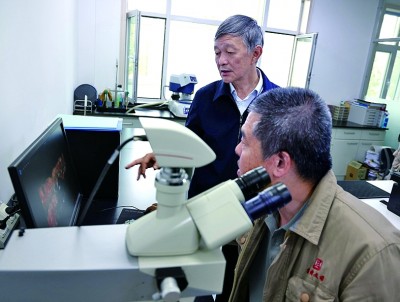 9月26日,敦煌研究院院長(zhǎng)蘇伯民(左)與同事一起在實(shí)驗(yàn)室觀察實(shí)驗(yàn)數(shù)據(jù)。