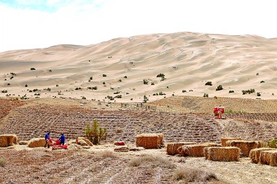 近年來,莫高窟已經(jīng)逐漸形成風(fēng)沙危害綜合防護(hù)體系,有效減輕了風(fēng)沙對(duì)石窟的影響。圖為7月23日,在莫高窟的崖頂上,工作人員正在鋪設(shè)草方格固沙。