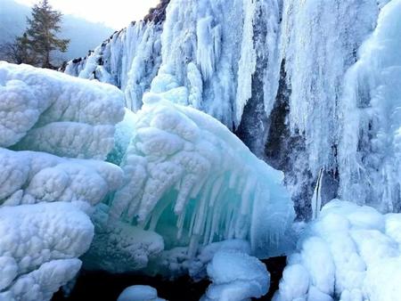 往前走,山和山之間的天顯得窄小了,抬頭,并沒有鷹飛過。懸崖峭壁上是一簾簾冰掛冰瀑,老天爺最寫意的畫作,是用白水晶,羊脂玉做成的。心里沸騰著歡喜,眼睛卻被這世界上最純凈的光芒刺出了淚,這凝固的千堆雪,這些白玉蘭,這些合歡樹,對嗎?不對。這些冰瀑,站在遠處和近處看到的物像都不相同,正面和側(cè)面觀看,更是形態(tài)各異。