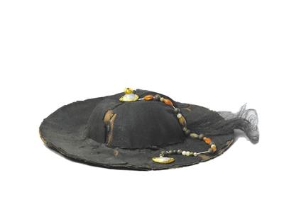 這一頂鑲寶石鈸笠帽,可要豪華貴重得多,這是一頂帽頂垂有一串玉石珠串飾的帽子,帽的直徑有35厘米?!洞笤湔隆吩涊d有人搶走蔡國祥懸有紅瑪瑙珠串的棕帽的事??梢娒鄙洗勾椧彩窃F族的風(fēng)氣。這種帽子的流行始于元成宗大德年間(1297—1307),一個商人賣給官府一塊紅剌子(紅寶石)重一兩三錢,用于鑲嵌帽頂。從此以后,歷代皇帝相承。凡元旦及天壽節(jié)大朝賀時都戴這種鈸笠帽。漳縣元代汪世顯墓出土的這頂鈸笠帽,帽頂鑲金裹玉,由帽頂垂系31顆珠玉組成的串練。以珠玉寶石來裝飾帽子,帽子的價值之高昂自不待言。