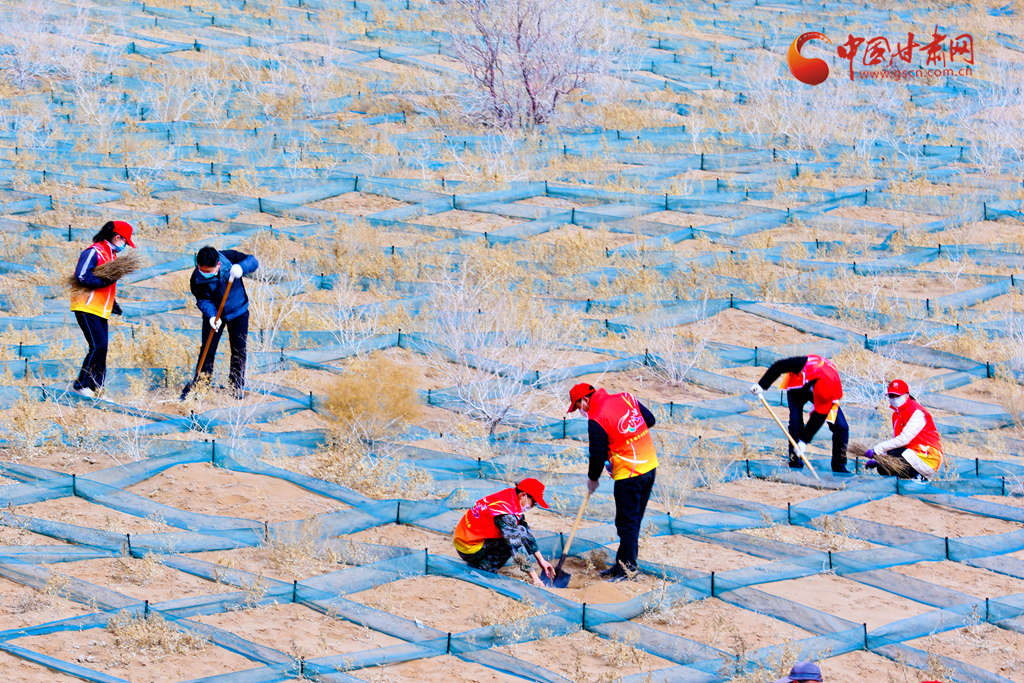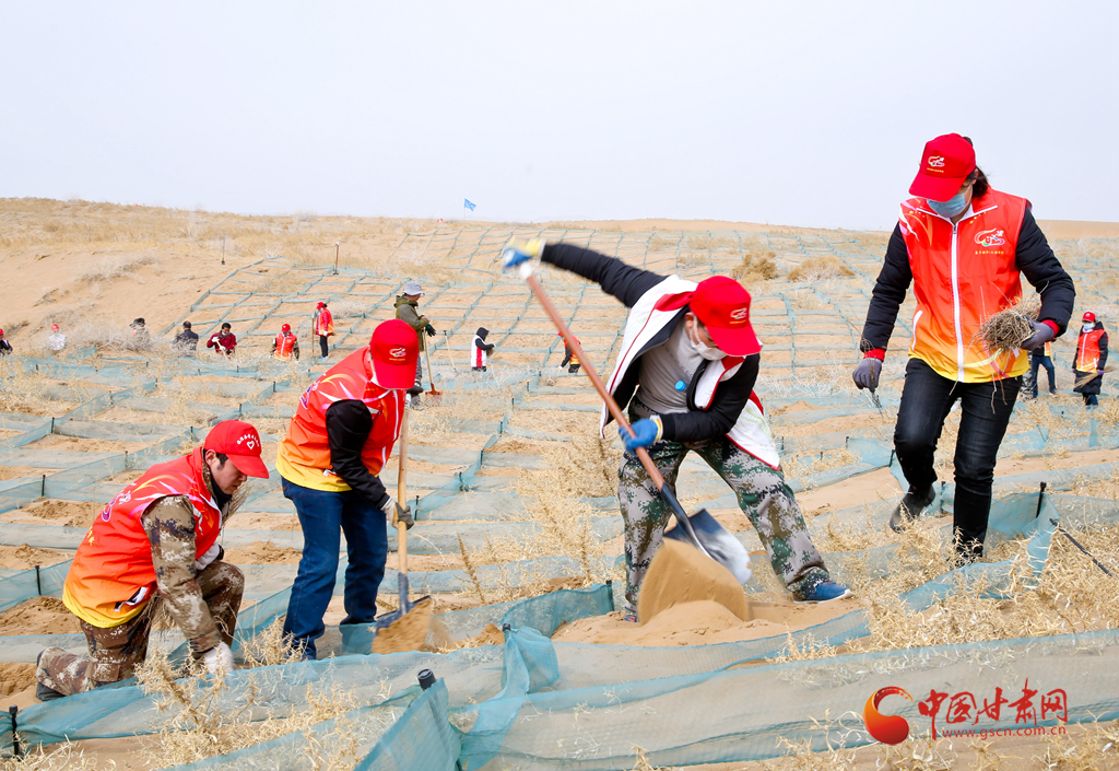 當(dāng)日,張掖市臨澤縣市民來到平川鎮(zhèn)一治沙區(qū)義務(wù)壓沙障、栽梭梭,拉開了造林3.64萬畝、防沙治沙3萬畝年度改善生態(tài)環(huán)境“接力賽”的帷幕。